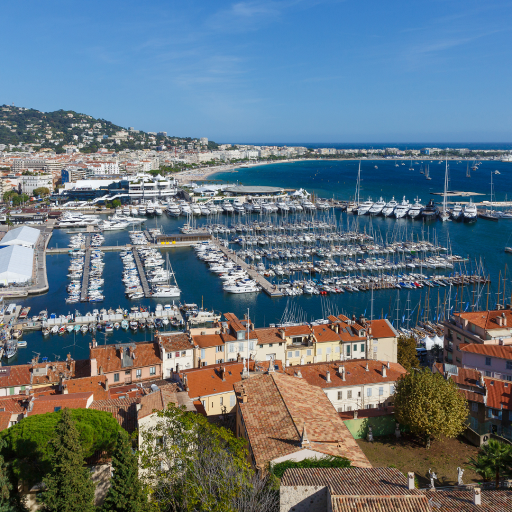 カンヌの魅力は、まずそのロケーション!地中海沿岸に位置し、キラキラ輝く青い海と、風光明媚な街並みが広がります。一度この景色を目にすると、日常の忙しさなんて忘れてしまいますよ🌴