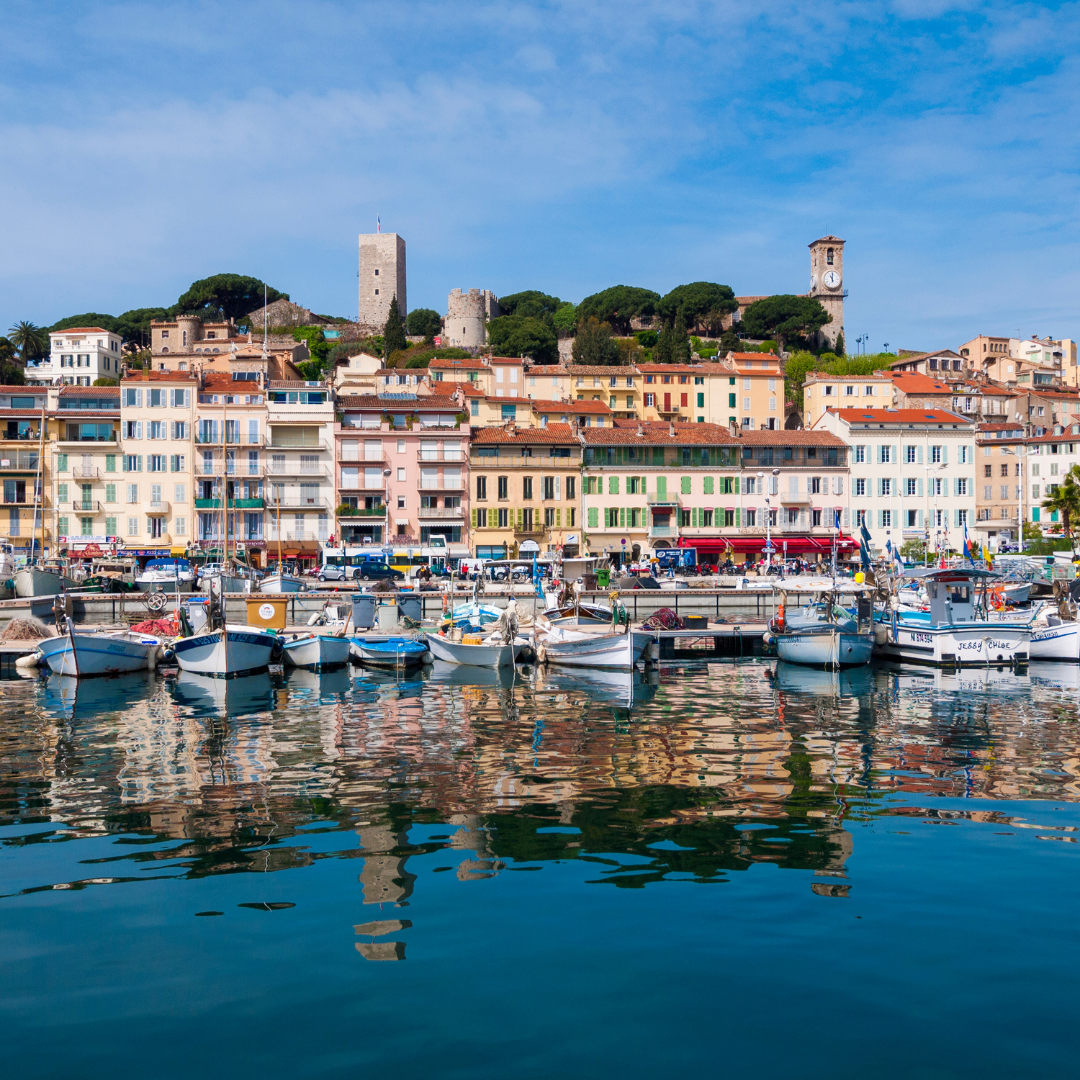 カンヌの魅力は、まずそのロケーション!地中海沿岸に位置し、キラキラ輝く青い海と、風光明媚な街並みが広がります。一度この景色を目にすると、日常の忙しさなんて忘れてしまいますよ🌴