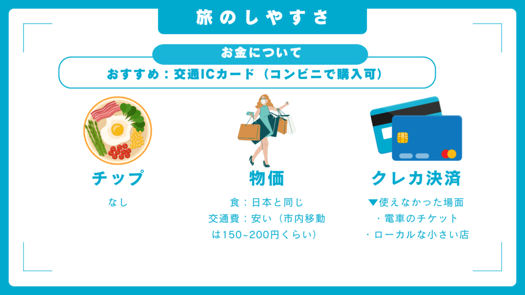 物価は日本と同じくらいで、交通費はとても安いです!