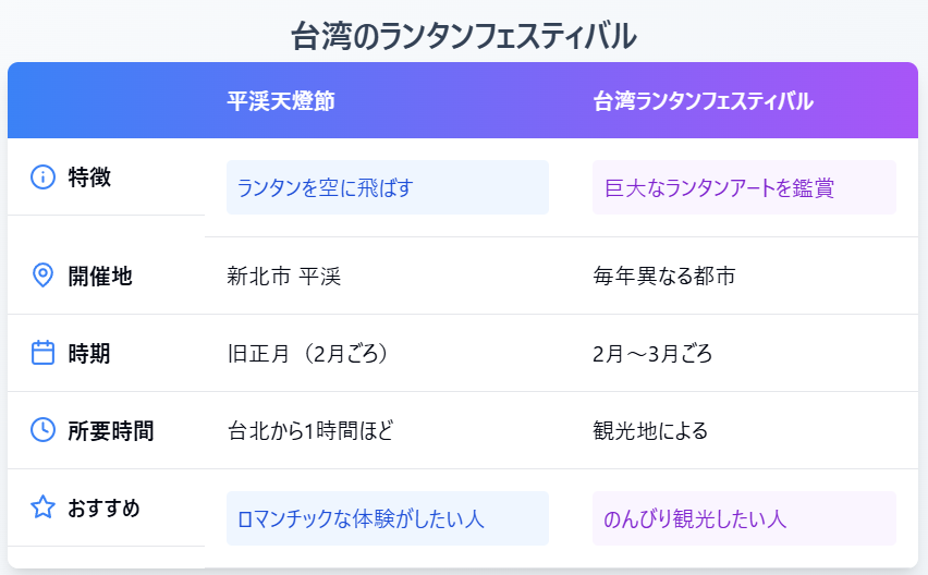 どちらも 台湾の文化を感じられる素敵なイベント なので、旅行の目的に合わせて選んでみてくださいね!